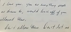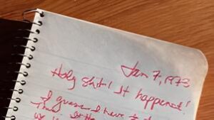 Thank you for getting your journal into my hands. My emotions have softened and I realize what a gift this is. I did occupy a good deal of space in your head. I’ve been so angry for so long with you trying to get me to buy into your scenario that we never should have been together. It’s good to have validation about those days—though I wish you had given this to me before you died.